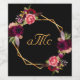 A chic black background with a faux gold geometric frame. Decorated with dark purple and burgundy flowers, roses and boho style feathers. Personalise and add your monogram, initials. Your family name's initial in the middle with a capital letter. Golden coloured letters.