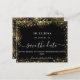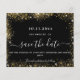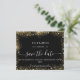 A modern and elegant Save the Date for a wedding. A black background decorated with faux gold glitter. sparkles. Personalise and add a date and names. The text: Save the Date is written with a large trendy hand lettered style script.