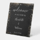 A welcome sign for a wedding. A stylish black background decorated with faux gold glitter sparkles. Personalise and add your names and the wedding date. White letters.