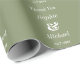 Bride and Groom Green and White Wedding Wrapping paper, Sage Green Wrapping Paper. You can change the text using personalise this template option.