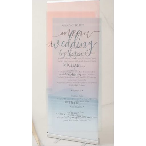 "Wedding by the sea under peachy sky sunset" is a captivating wedding design that beautifully captures the essence of a romantic seaside celebration. The custom typography, boldly displaying the words "Wedding by the Sea" takes centre stage, serving as a focal point that sets the tone for the entire design.