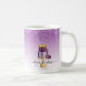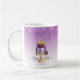 This elegant bakery business coffee mug features an illustration of an ornate purple and gold wedding cake on a purple ombre background, with a top border of purple dripping faux glitter. Customise it with your business name in black handwriting script with swashes at the beginning and end, and your name in black sans serif font. (To keep the swashes, replace only the letters in those text fields, leaving the symbols in place.) The design appears on both sides of the mug.