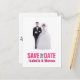 If you love kitsch, but are definitely all modern, this is a great save the date postcard that might send a little smirk. A retro bride and groom cake topper is featured on the front, but the type is all contemporary. Customised details of your event go on back. Available in alternate colours with matching products.