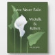 A graphic illustration of a calla lily flower by artist/designer Charmaine Paulson on a "Love never fails" custom wedding plaque.