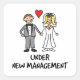A cute cartoon of a newlywed couple captioned 'under new management'. Is it the bride or groom that wears the trousers in the marriage? Great for a wedding gift.