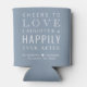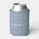 A fun favour gift for your wedding guests, bridal party and groomsmen. This dusty blue can cooler features "Cheers to Love Laughter & Happily Ever After Party" in a mix of modern and elegant white typographies, your first names and wedding date.