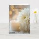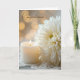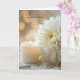 A glowing candle sits beside a large soft chrysanthemum flower on a lace surface surrounded by warm bokeh lights in the background for a wedding congratulations.