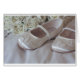 two small wedding shoes for a bridesmaid or flower girl in ivory silk with a bouquet behind