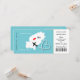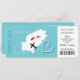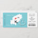 A fun but stylish wedding invitation in a boarding pass/ticket style for couples getting married abroad in Ibiza which is shown in a white map silhouette on teal blue with sweet red love hearts, aeroplane silhouette and white beads swirling into a heart shape. The reverse is easy to customise with your personal details and a photo of the happy couple