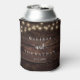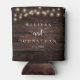 Wedding Dinner and Party, Rustic String Lights, dark brown tan wood background Can Cooler