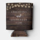 Wedding Dinner and Party, Rustic String Lights, dark wood background Can Cooler