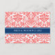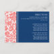 Direction card inserts for wedding in elegant and modern peach orange pink, dark navy blue and white chic and classic floral damask vintage pattern. Customise these cards with your wedding directions or other information to be included with your wedding invitations, also perfect for anniversary parties or birthday parties. Available in a wide range of matching wedding products.