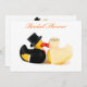 Bride and groom rubber ducks kissing. Top hat and tails with flower tiara. Cute wedding invitation or card that can be customised with your own text, names, date and images.
