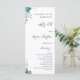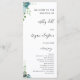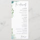 Program card for wedding celebration designed with dusty blue floral, minimalistic text font and caligraphy names.