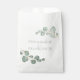 This design features a wedding eucalyptus reception treat candy favours classic calligraphy script bag, with an elegant fancy script typography, elegant guest goodie bag, eucalyptus rehearsal dinner cookies, reception green and white, elegant thank you treat doggie, bar cookie pet candy favours, elegant reception treat, wedding reception party favours