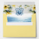 These elegant envelopes feature the word "Wedding" in white over a yellow background. The envelope opens to reveal an ornate watercolor blue crest with an ocean scene and yellow hibiscus flowers. Use the template fields to add your custom return address and monogrammed initial. To see the matching suite visit www.zazzle.com/dotellabelle
