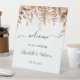 Welcome to an elegant, boho style wedding. A chic white background. Decorated with fall watercolored eucalyptus leaves, woodland ferns. Personalise and add the names of the bride and groom and a date. Welcome is written with heart swashes.