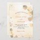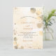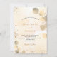 A golden watercolored background decorated with golden eucalyptus and faux gold glitter dust. Personalise and your name and ceremony details. Black and golden coloured letters.