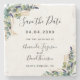 A trendy Save the Date coaster for your guests. Eucalyptus greenery and golden foliage. Personalise and add the wedding date, your names and the venue place.