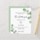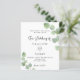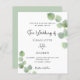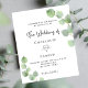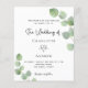 A white background decorated with eucalyptus greenery sprigs. Personalize and your name and ceremony details. Black colored letters.