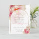 Wedding INVITATION | Modern text fits nicely inside this beautiful sheer white gold edged arch frame that shows the underlying fantasy bright coral rose peony flower edged in gold - original artwork © by WhimsicalArtwork™.