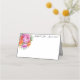 This folded name place card is shown in basic white with a lovely pink and orange colour peony floral mix accent and has sample custom names.