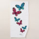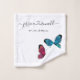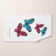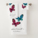 Butterflies bathroom towel set with newlyweds names and wedding date. The set is made of three towels: a wash cloth, hand towel and bath towel. They are all decorated with lovely blue and red butterfly illustrations. Each of them also has couple's names printed in calligraphy style cursive script and connected with a heart in the middle. In addition each has a date printed under the custom names. Customise it by replacing the sample names with the names of the couple getting married and their wedding date. The date can be left out if the design. These make a beautiful personalised wedding gift idea.