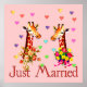 Two cute giraffes hold bouquets of flowers as rainbow colored hearts surround them. Equally lovely for a gay or straight wedding rehearsal, informal ceremony, and reception.
