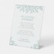 Sage green hand drawn growing leaf botanical art wedding in loving memory sign. Simple hand drawn leaf design circling your own personalised In loving memory words to those unable to with you on your special day but remembered with love. Pretty shades of sage muted blue green and grey on white. Other colours and matching items available. © Original leaf drawing and design by Sarah Trett for www.mylittleedenweddings.com on zazzle.