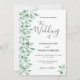 A trendy botanical wedding invitation in white and green. A chic white background on the front. Decorated with greenery, foliage and sprigs. Modern large handlettered script, typography with the text: The wedding of. Templates for names and wedding details. Dark grey text.