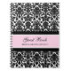 Spiral wedding guest book notebook in light pink, black and white classic floral damask pattern, with customisable text to add your own name and wedding date.