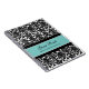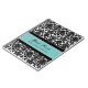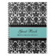 Spiral wedding guest book notebook in turquoise blue, black and white classic floral damask pattern, with customisable text to add your own name and wedding date.