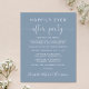 Budget-friendly dusty blue elopement or smaller wedding announcement and reception or celebration party invitation. The front features "Happily Ever After Party" in a mix of simple white typography and an elegant white script with swashes, and you can personalise your message and invitation in more detail and your names in a signature-like script. The reverse side features your first names and wedding date.