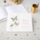 Beautiful inked art butterflies and floral graphic swirl wedding guest book in pink, cream, aqua teal and brown. Personalise with your own names and wedding date. Original butterfly ink sketched art and graphic design by Sarah Trett for www.mylittleedenweddings.com
