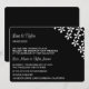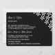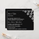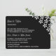 Wedding invitation shown in a classic but modern layout in the colours of black and white with a whimsical flower pattern.