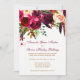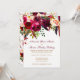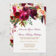 This beautiful burgundy watercolor florals and feathers wedding invitation has features burgundy, crimson, aubergine, and cream roses or peony type flowers with greenery leaves and branches in shades of olive green, rust, burnt orange, and brown, along with assorted colourful feathers in orange, purple, grey, and black. The customisable wording is in a gold and burgundy colour palette and the back has an all-over pattern of bouquets in the same colours.