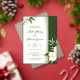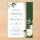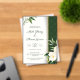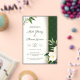 An elegant wedding invitation featuring a white and green floral design with lush leaves and blossoms on the left side, complemented by a dark green patterned background with a gold vertical stripe on the right. The text invites guests to the wedding celebration of Matt Zhang and Shawn Garcia, scheduled for Sunday, March 10 at 9:00 PM at 123 Anywhere St., Any City, with a reception to follow. RSVP details include a website (www.reallygreatsite.com) and a phone number (+123-456-7890), ending with a warm message looking forward to celebrating with guests.