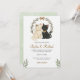 A wedding invitation card with a beige and black cat illustration under a floral wreath. It reads "Sophia & Richard," detailing date and venue, with a soft, romantic tone.