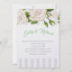 This romantic wedding invitation is shown in a White background colour with soft Silver/Grey stripes and lovely white roses print at the top. A fresh but formal written layout and text with fancy colourful script highlighting the names of the Bride and Groom. Sample shown in Green.
