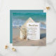 A blank card and envelope rest on a sandy beach surrounded by seashells, a starfish, and a turquoise ocean background for a wedding invite.