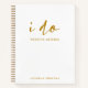 A stylish wedding journal with handwritten script typography "I do" paired with modern typography title and bride and groom names in gold on a simple white background.