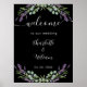 A black coloured background. Decorated with lavender florals, flowers and eucalyptus greenery. White letters. Personalise and add your names and the wedding date.