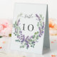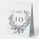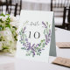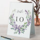 A stylish white backgrond decorated with violet, lavender florals and eucalyptus greenery. Personalise and your table numbers. Black letters.