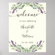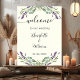 Ivory coloured background. Decorated with lavender florals, flowers and eucalyptus greenery. Black letters. Personalise and add your names and the wedding date.