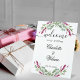 A chic white background. Decorated with pink lavender florals, flowers and eucalyptus greenery. Violet and black letters. Personalise and add your names and the wedding date.