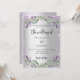 A modern, stylish wedding invitation. A faux silver looking background with violet faux glitter, sparkles, lavender florals, flowers and eucalyptus greenery. Personalise and add your names and the details.