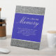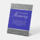 Elegant, simple glitter silver and royal blue wedding memorial table pedestal sign with modern calligraphy script.