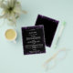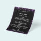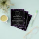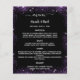 An elegant, glamourous wedding menu. A black background, decorated with purple faux glitter, sparkles. White text. Personalise and add your name, dates and the menu.