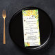 A wedding menu for a rustic summer wedding. Cute bumble bees, yellow florals, and dripping honey from honeycomb. Personalise and add your names, date and the wedding menu. The word Menu is written with a trendy hand lettered style script with swashes.