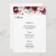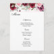This wedding menu card is shown on basic white paper in a lovely pink and plum colour roses print. Script and standard text in a Black colour.